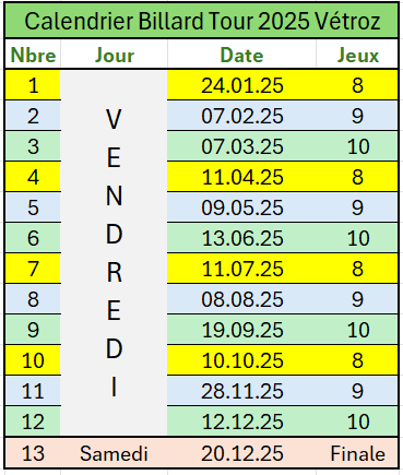 Calendrier 2025 Vétroz 2025 - BillardRomand